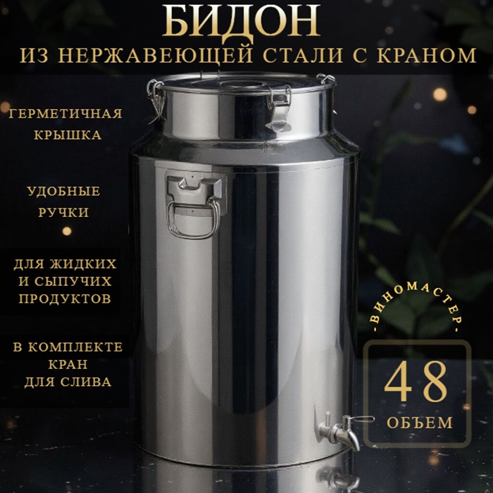 Бидон из нержавейки объемом 48 л "Виномастер" предназначен для длительного хранения пищевых жидкостей (воды, масел, соков, алкогольных напитков) и сыпучих продуктов (круп, орехов, семечек, сухофруктов). Может использоваться в качестве емкости для брожения.