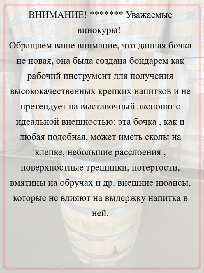Дубовая Бочка 113л (30 галлонов) идеально подойдет для основной и финишной выдержки виски и других крепких напитков. Бочки свежеслитые, слив - весна 2025 года.