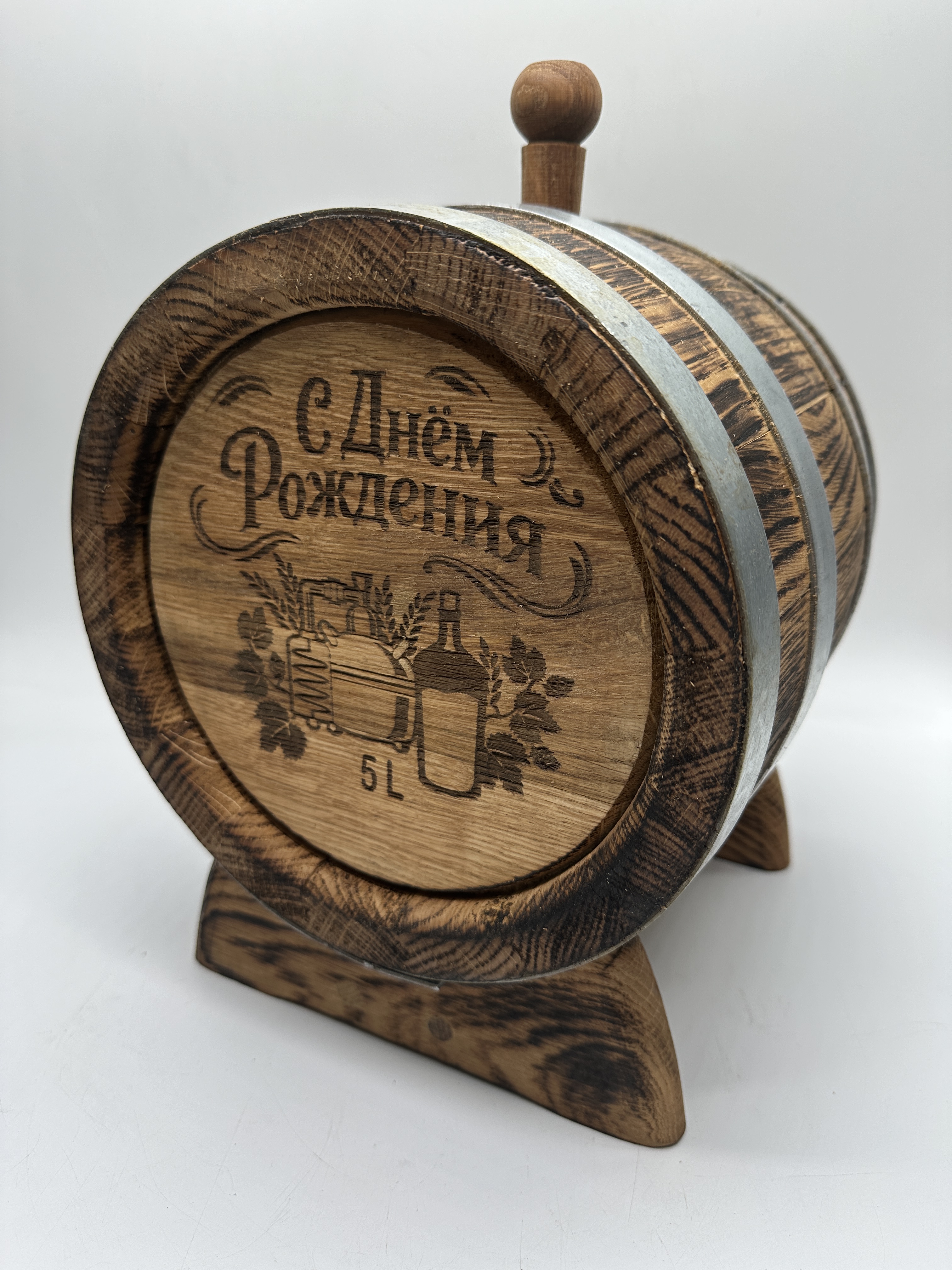 Дубовая бочка подарочная «С ДНЕМ РОЖДЕНИЯ» внешний обжиг 5 л (кавказский дуб)