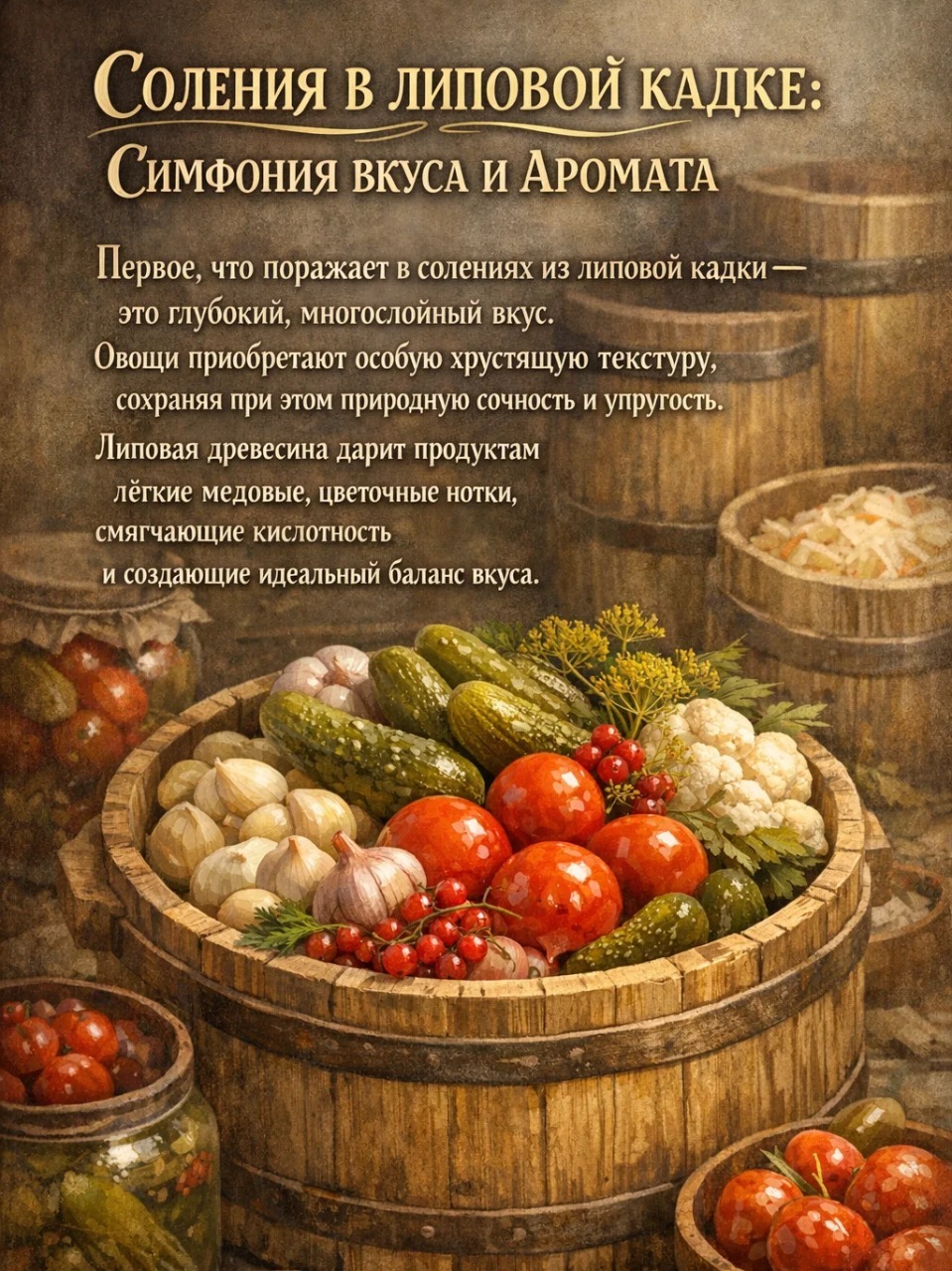 - Соленья получаются без постороннего привкуса: древесина липы не имеет ярко выраженного запаха, она лишь подчеркивает и усиливает природный аромат продуктов.